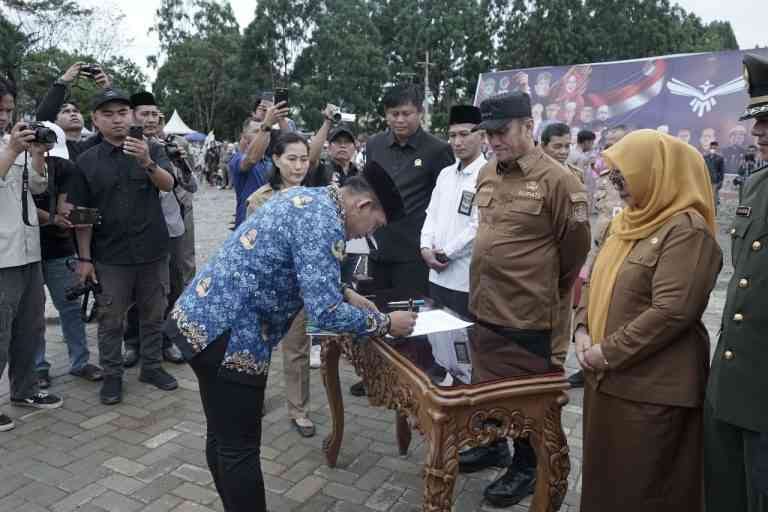 Suasana haru dan penuh semangat mewarnai prosesi penyerahan SK yang digelar usai pelaksanaan upacara peringatan Hari Lahir Pancasila, di Lapangan Pendidikan, Desa Puncak Indah, Kecamatan Malili, Senin 2 Juni 2025.