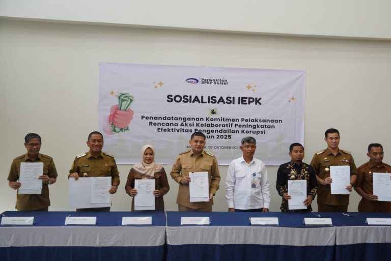 Penandatanganan komitmen tersebut dilakukan pada kegiatan Sosialisasi Indeks Efektivitas Pengendalian Korupsi (IEPK) yang berlangsung di Ruang Diklat Perwakilan Badan Pengawasan Keuangan dan Pembangunan (BPKP) Provinsi Sulawesi Selatan, Selasa (7/10/2025).