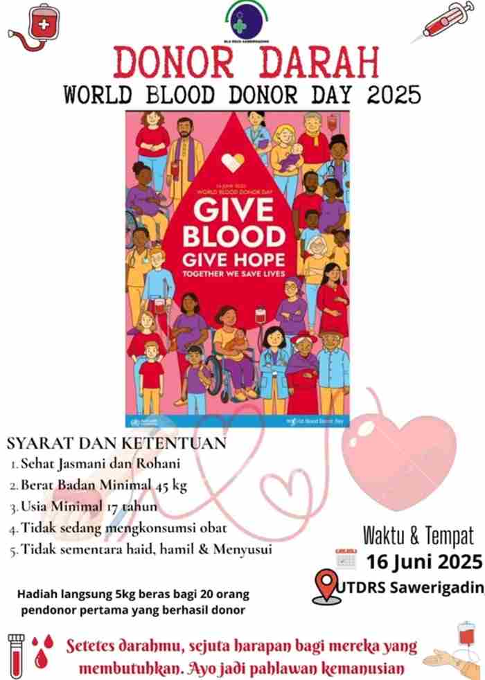Kegiatan donor darah ini akan digelar di Unit Transfusi Darah (UTD) RS Sawerigading, Jl. Dr. Ratulangi, Rampoang, Kecamatan Bara, Kota Palopo, Senin (16/6/2025).