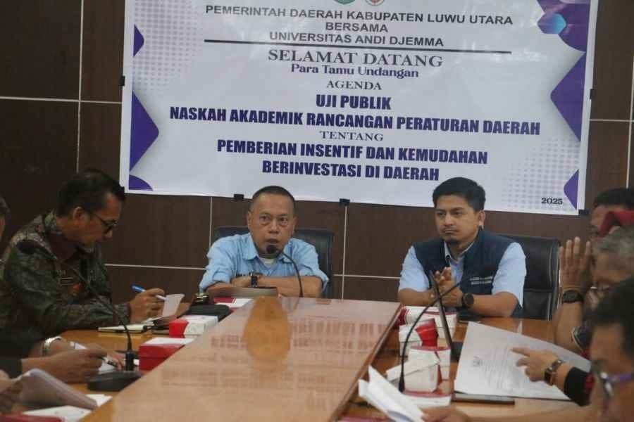 LINISULSEL.COM, LUWU UTARA – Penjabat (Pj) Sekretaris Daerah (Sekda) Kabupaten Luwu Utara, Jumal Lussa, secara resmi membuka kegiatan Uji Publik Naskah Akademik Rancangan Peraturan Daerah (Ranperda) tentang Pemberian Insentif dan Kemudahan Penanaman Modal, yang berlangsung di Ruang Rapat Wakil Bupati, Kamis (23/10/2025).