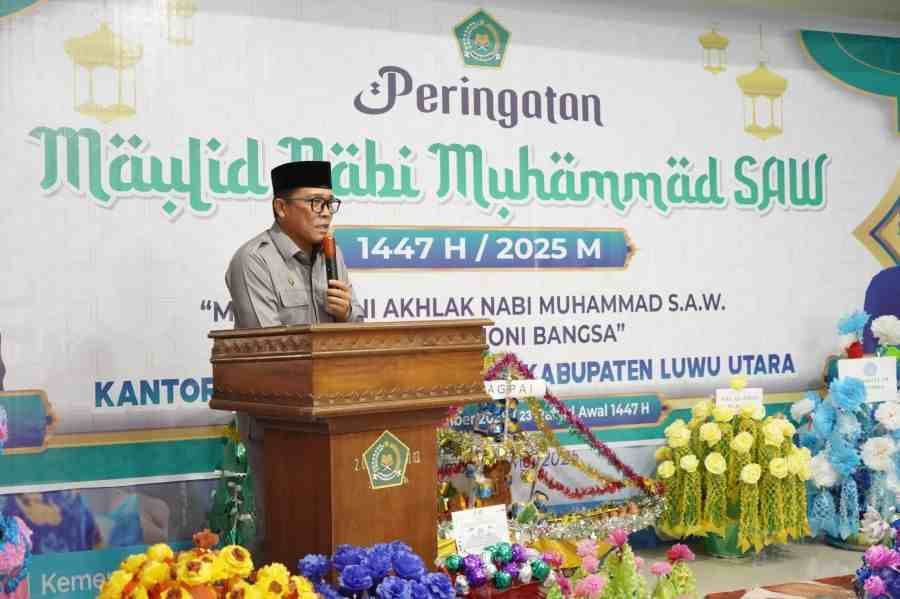 LINISULSEL.COM, LUWU UTARA – Wakil Bupati Luwu Utara, Jumail Mappile, menghadiri perayaan Maulid Nabi Muhammad SAW di Kantor Kementerian Agama (Kemenag) Luwu Utara, Selasa (16/9/2025).