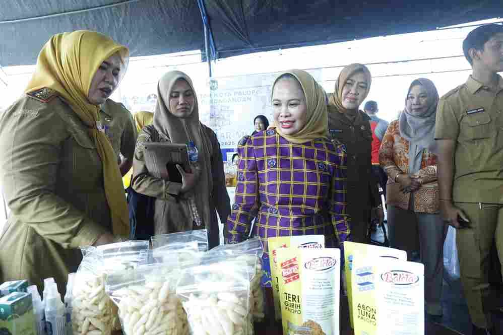 Walikota Palopo meninjau stan Dinas Ketahanan Pangan, Dinas Perdagangan, KORPRI, Mitra (vendor dan distributor) dan UMKM lokal yang berkolaborasi dalam GPM yang menghadirkan bahan pangan yang terjangkau bagi masyarakat.